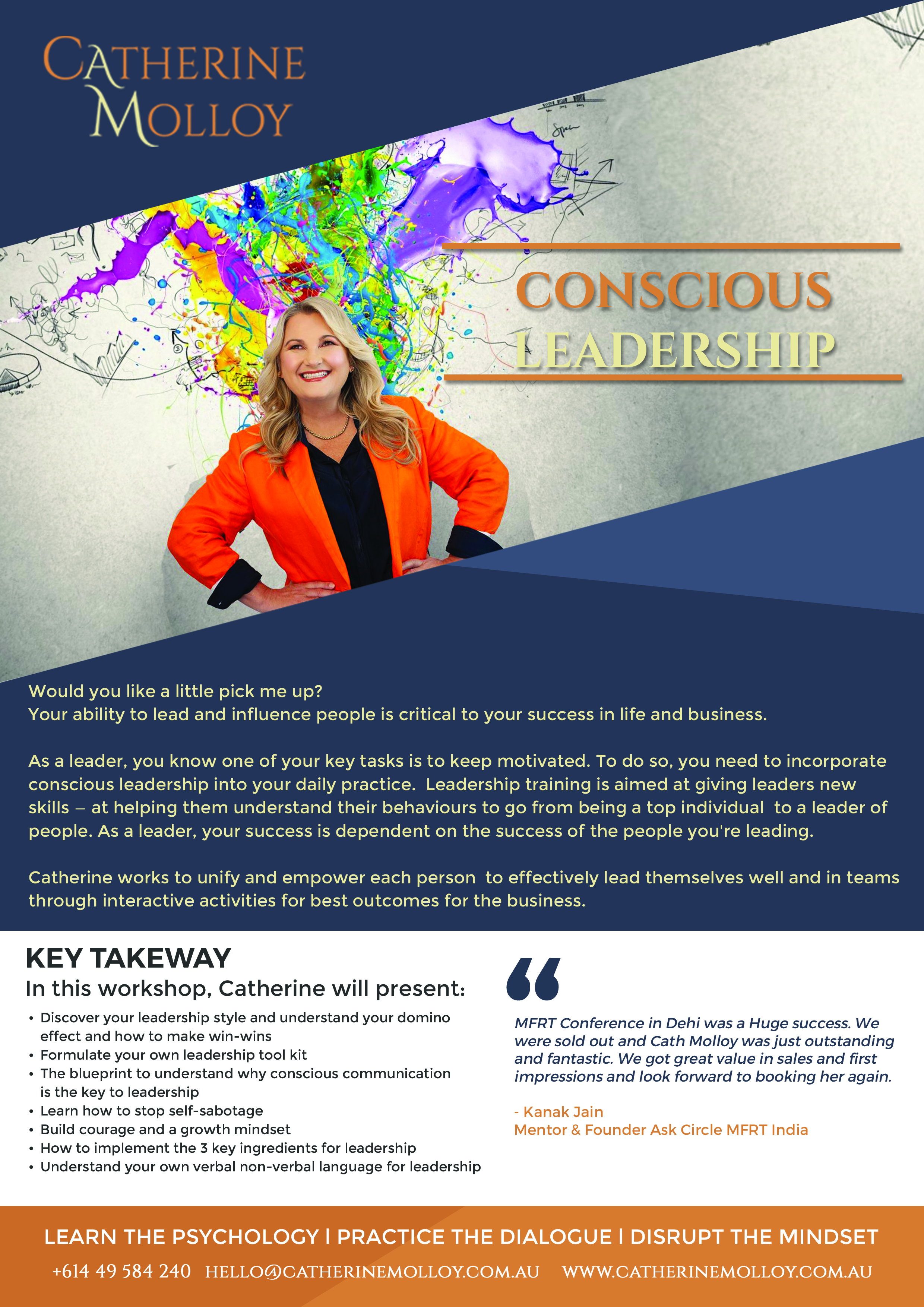 Catherine knows when and where to motivate and add energy with each talk and workshop delivered. The participants will engage, connect and be more conscious of their own energy language. Fun, Fast and Forward-Thinking.